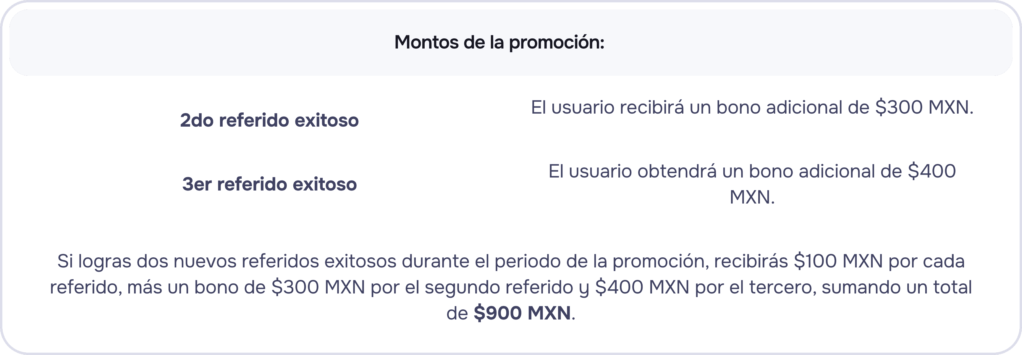 Los bonos adicionales aplican exclusivamente para el segundo y tercer referido exitoso realizados durante el periodo de la promoción.